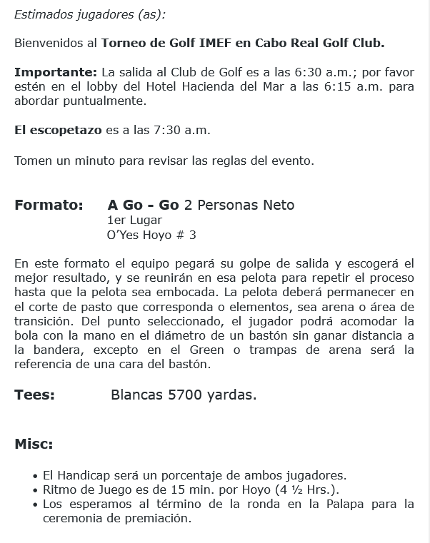 salida al Club de Golf es a las 6:30 a.m.;